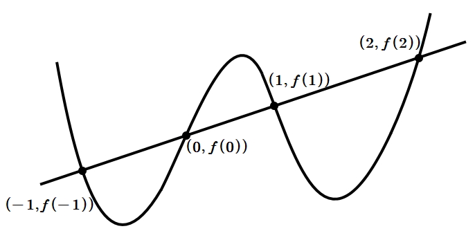 사차함수 $ f ( x) $에 대하여 네 수 $ f ( -1) $, $ f ( 0) $, $ f ( 1) $, $ f ( 2) $가 이 순서대로 등차수열을 이루면 네 점 $ ( -1,~f ( -1)) $, $ ( 0,~f ( 0)) $, $ ( 1,~f ( 1)) $, $ ( 2,~f ( 2)) $ 은 일직선 위에 존재한다.