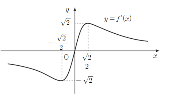 $$ \begin{array}{c|ccccc} x & \cdots & -\frac{1}{\sqrt{2}} & \cdots & \frac{1}{\sqrt{2}} & \cdots \\ \hline f’(x) & - & 0 & + & 0 & - \\ \hline f(x) & \nearrow & -\sqrt{2} & \searrow & \sqrt{2} & \nearrow\end{array}$$