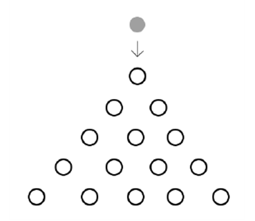 (1) 위와 같이 검은 공이 떨어지고 있다. 검은 공이 흰 공과 충돌할 때는 같은 확률로 좌우로 갈라지게 된다. 검은 공과 가장 밑의 $5$개의 흰공들이 충돌할 확률은 각각 얼마나 될 지 구하시오.