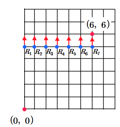$(0,~0)$에서 $R_3$으로 간 후 화살표 방향으로 가서 $(6,~6)$에 도달하는 방법의 수 : ${}_7 \mathrm C _5$$\vdots$