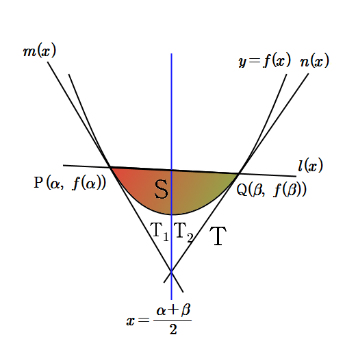 $\mathrm{PQ}$를 지나는 직선을 $l(x)$라 하면 $y=f(x)$와 $y=l(x)$의 교점의 $x$좌표는 $\alpha,~\beta$이므로 이차함수 $f(x)$와 직선 $l(x)$로 둘러싸인 넓이 $S$는