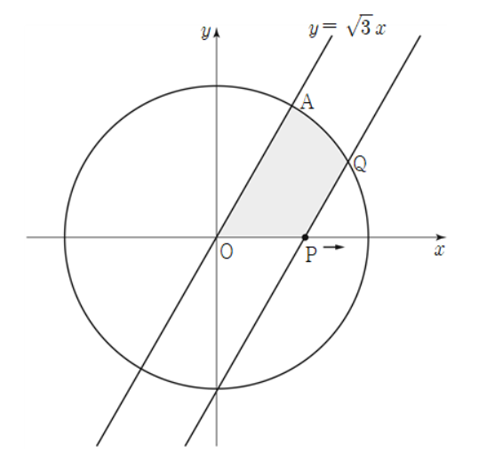 점 $ \rm P \left ( 2 \it t,0 \right ) $을 지나고 직선 $ y= \sqrt {3} x $에 평행한 직선을 $ l $이라 하면
