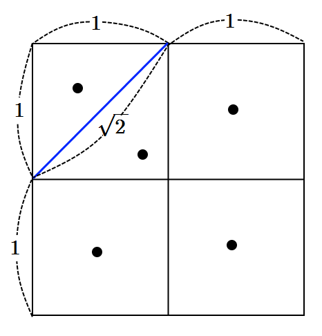 1. 한 변의 길이가 $\displaystyle 2 $인 정사각형에 $\displaystyle 5 $개의 점이 있으면, 두 점 사이의 거리가 $\displaystyle \sqrt {2} $이하인 두 점이 반드시 존재함을 보여라.
