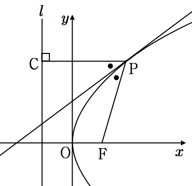 [정리1] 포물선 위의 점 $\displaystyle \mathrm { P} $에서의 접선은 $\displaystyle \mathrm { \angle CPF }$를 이등분한다. ($\displaystyle \mathrm { F} $는 초점, $\displaystyle \mathrm { C} $는 점 $\displaystyle \mathrm { P }$에서 준선 $\displaystyle l $에 내린 수선의 발)