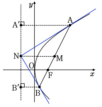 (2) $\displaystyle \mathrm { A,~B} $에서의 접선은 준선 위의 점 $\displaystyle \mathrm { N }$에서 만난다.