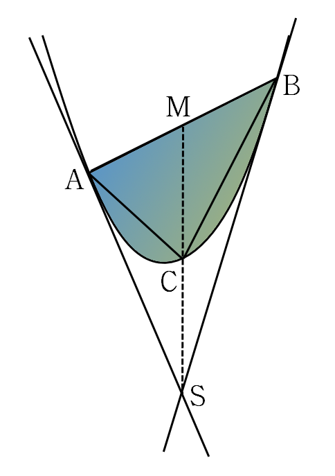 [정리4] 포물선 위의 두 점 $\displaystyle \mathrm { A,~B }$의 중점을 $\displaystyle \mathrm { M }$이라 하고, 또, 두 점 $\displaystyle \mathrm { A,~B }$에서의 접선이 점 $\displaystyle \mathrm { S }$에서 만난다고 할 때, 선분 $\displaystyle \mathrm { MS }$와 포물선의 교점을 $\displaystyle \mathrm { C }$라 하자. 다음이 성립함을 보이시오.