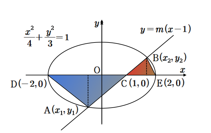 타원 $\displaystyle \frac {x ^ {2} } {4} + \frac {y ^ {2} } {3} =1 $과 $\displaystyle y=m \left ( x-1 \right ) $ ($\displaystyle m>0 $)의 교점의 $\displaystyle y $좌표가 필요하기 때문에 $\displaystyle x= \frac {y+m} {m} $을 타원에 대입해서 이차방정식을 만들자.