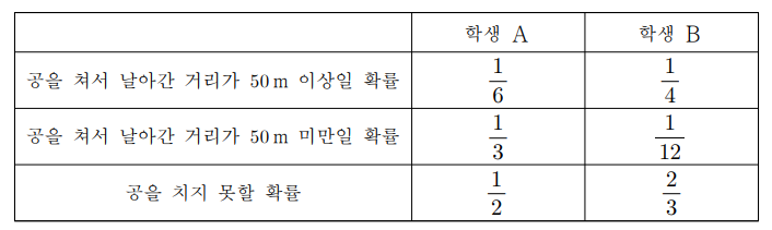 (2) 학생 \(\displaystyle A\)와 \(\displaystyle B \) 가 다음과 같은 확률로 공을 친다.