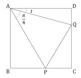 <가> 삼각형 \(\displaystyle \mathrm{PAQ} \)의 두 꼭짓점 \(\displaystyle \mathrm{P} \)와 \(\displaystyle \mathrm{Q} \)는 각각 변 \(\displaystyle \mathrm{BC} \)와 \(\displaystyle \mathrm{CD} \) 위에 있고, \(\displaystyle \mathrm{\angle PAQ}=\frac{\pi}{4} \) 이다. 선분 \(\displaystyle \mathrm{AD} \) 와 \(\displaystyle \mathrm{AQ} \)가 이루는 각의 크기를 \(\displaystyle t \) 라 하자. (단, \(\displaystyle 0 \leq t \leq \frac{\pi}{4} \mathrm{ABCD} )\)