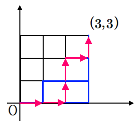 의 그림을 원점 \(\displaystyle (0,~0)\)에서 \(\displaystyle (3,~3)\)에 이르는 경로로 나타내어 보자.