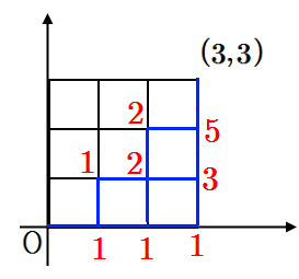 위의 그림에서 보듯이 파란색의 길을 따라 원점 \(\displaystyle \mathrm{O}\)에서 \(\displaystyle (3,~3)\)에 이르는 최단 경로의 수 \(\displaystyle 5\)와 같다.