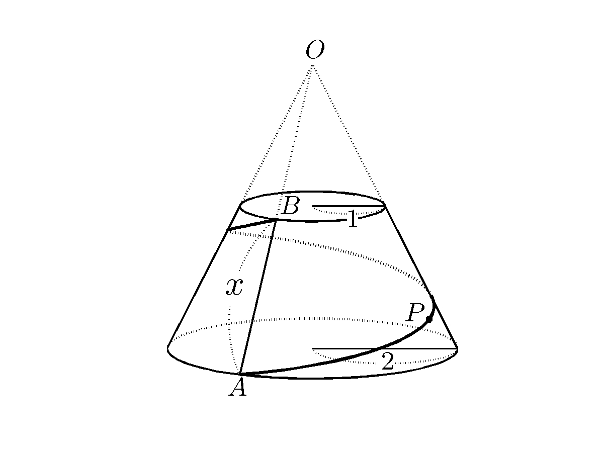 (나) 직원뿔의 꼭짓점 $ O $에서 밑면의 둘레 위의 한 점 $ A $를 잇는 모선의 중점을 $ B $라 하자. 그림 1과 같이 $ B $를 지나고 밑면과 평행한 평면으로 원뿔을 잘라 윗면의 반지름이 $ 1 $, 밑면의 반지름이 $ 2 $, 선분 $ AB $의 길이가 $ x $인 직원뿔대를 얻었다. 한 점 $ P $가 점 $ A $에서 출발하여 직원뿔대의 옆면을 한 바퀴 돌아 점 $ B $에 도달할 때, 그 경로가 최단거리를 가지게 되는 경우를 생각해 보자. (단, 경로는 윗면의 경계 또는 밑면의 경계의 일부를 포함할 수 있다.)