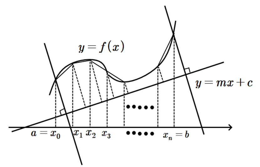 따라서 구간 \(\displaystyle [x _ {k-1} ,~x _ {k} ] \)에서 \(\displaystyle y=f ( x) \)와 \(\displaystyle y=mx+c \)로 둘러싸인 부분의 넓이는 \(\displaystyle \Delta S _ {k} \)는