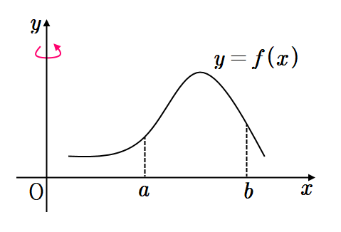 연속함수 $y=f(x) ~(a \leq x \leq b)$와 $x$축으로 둘러싸인 둘러싸인 부분을 $y$축의 둘레로 회전시킨 입체의 부피를 구하면