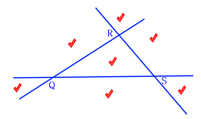 교선 $\mathrm {QR,~RS,~SQ}$로 세 점 $\mathrm {QRS}$을 지나는 평면을 어떻게 나누는지를 그림으로 나누면 아래와 같다. 아래 그림에서 만들어진 영역의 개수가 새로 생기는 공간에서의 영역의 개수이다. 즉, $7$개 이다.