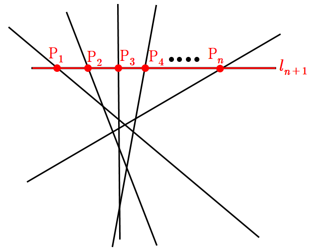 아래 그림에서 보듯이 먼저 직선 $n$개의 직선으로 평면이 최대한 분할되어 있다고 하자. 여기에 직선 $l_{n+1}$을 추가한다고 하자.