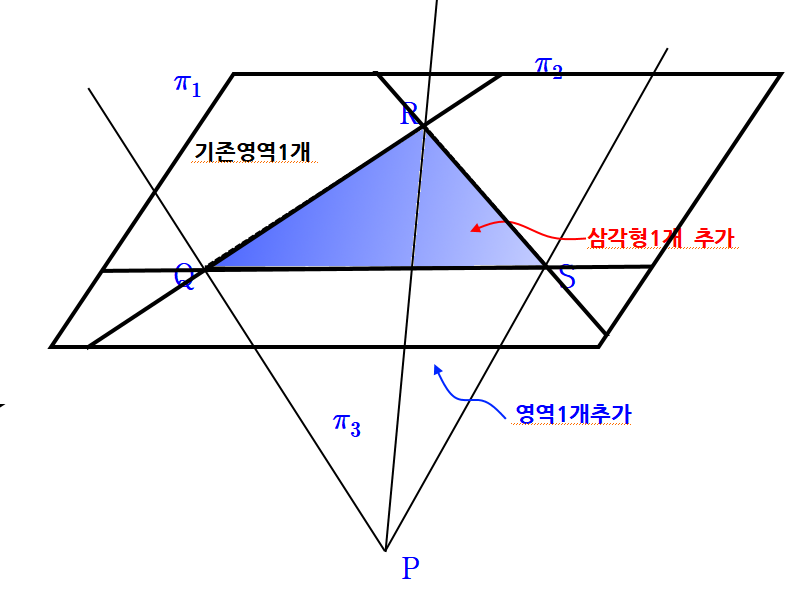 이를 통해 새로운 평면 $\pi_4$가 기존의 평면 ($\pi_1 ,~\pi_2 ,~\pi_3$)과 만나서 생기는 영역의 개수만큼 공간을 나눈다. 왜냐하면 기존공간의 영역을 평면의 영역(위에서는 삼각형)으로 나눠 새롭게 하나 더 생기게 만든다. 공간적으로 생각해보세요.
