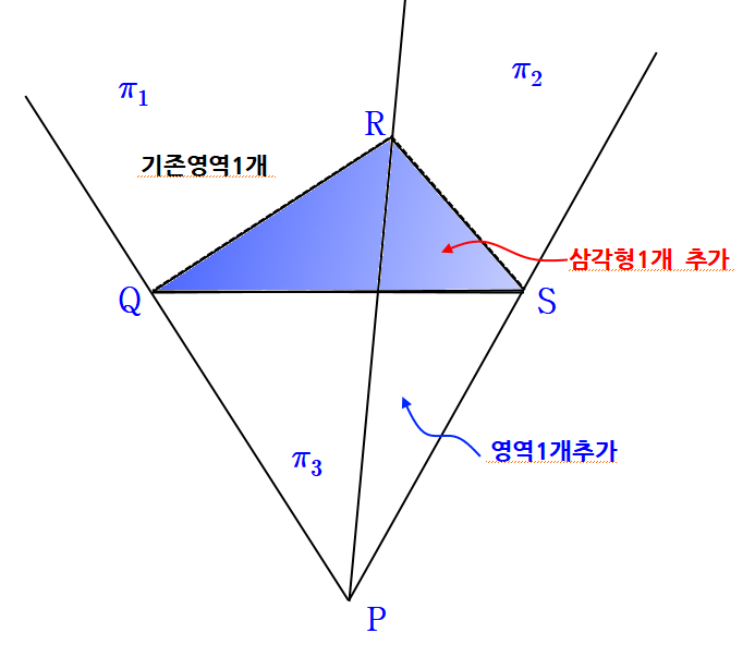 점에 의해 직선이 하나 더 분할 되듯이 선분이 하나 더 추가됨에 따라 위의 그림에서 보듯이 영역이 1개였던 부분이 영역이 추가되어 2개가 되었다. 여기서 주의해야 하는 것은 직선이 아니라 선분이 하나 추가됨에 따라 영역이 1개 더 추가된다는 것이다.