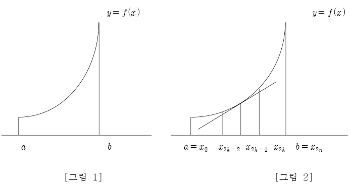[문제 1-2] [그림 2]는 [그림 1]의 닫힌구간 $ \left [ a,~b \right ] $를 $ 2n $개의 균등한 소구간으로 나눈 그래프이다. 이때, 점 $ ( x _ {2k-1} ,~f ( x _ {2k-1} ) ) $에서의 접선의 식을 $ y=g _ {k} ( x) $이라고 하자.