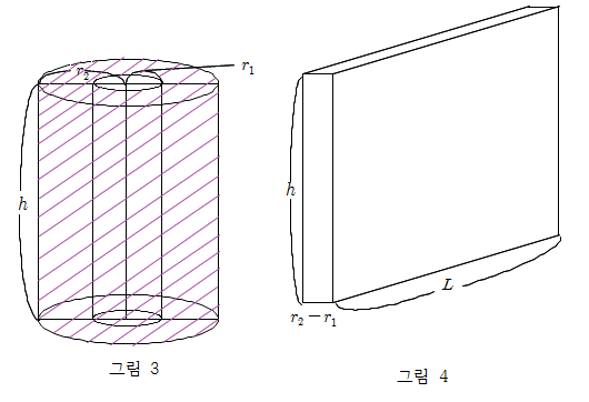 (2) 그림3에서 빗금 친 부분의 한 쪽을 잘라서 펼친 모양이 그림4와 같다고 할 때 길이 $ L $을 정의하시오.
